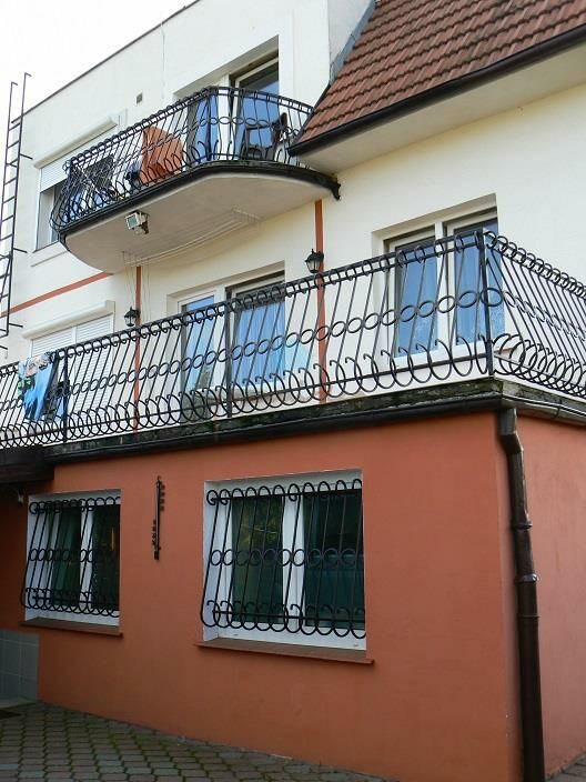 Cała posesja jest ogrodzona, a front stanowi kuty płot na podmurówce.
