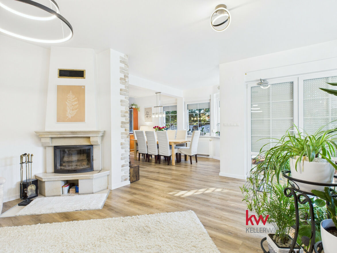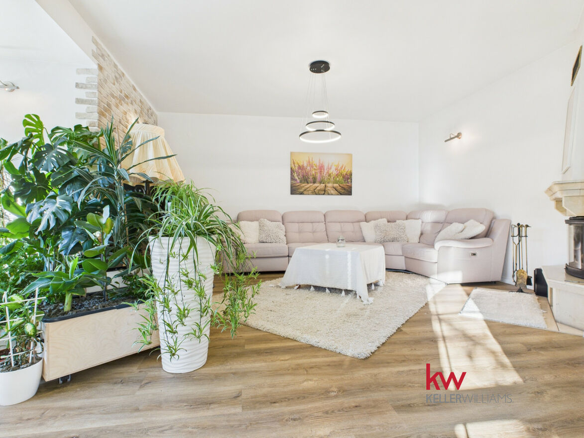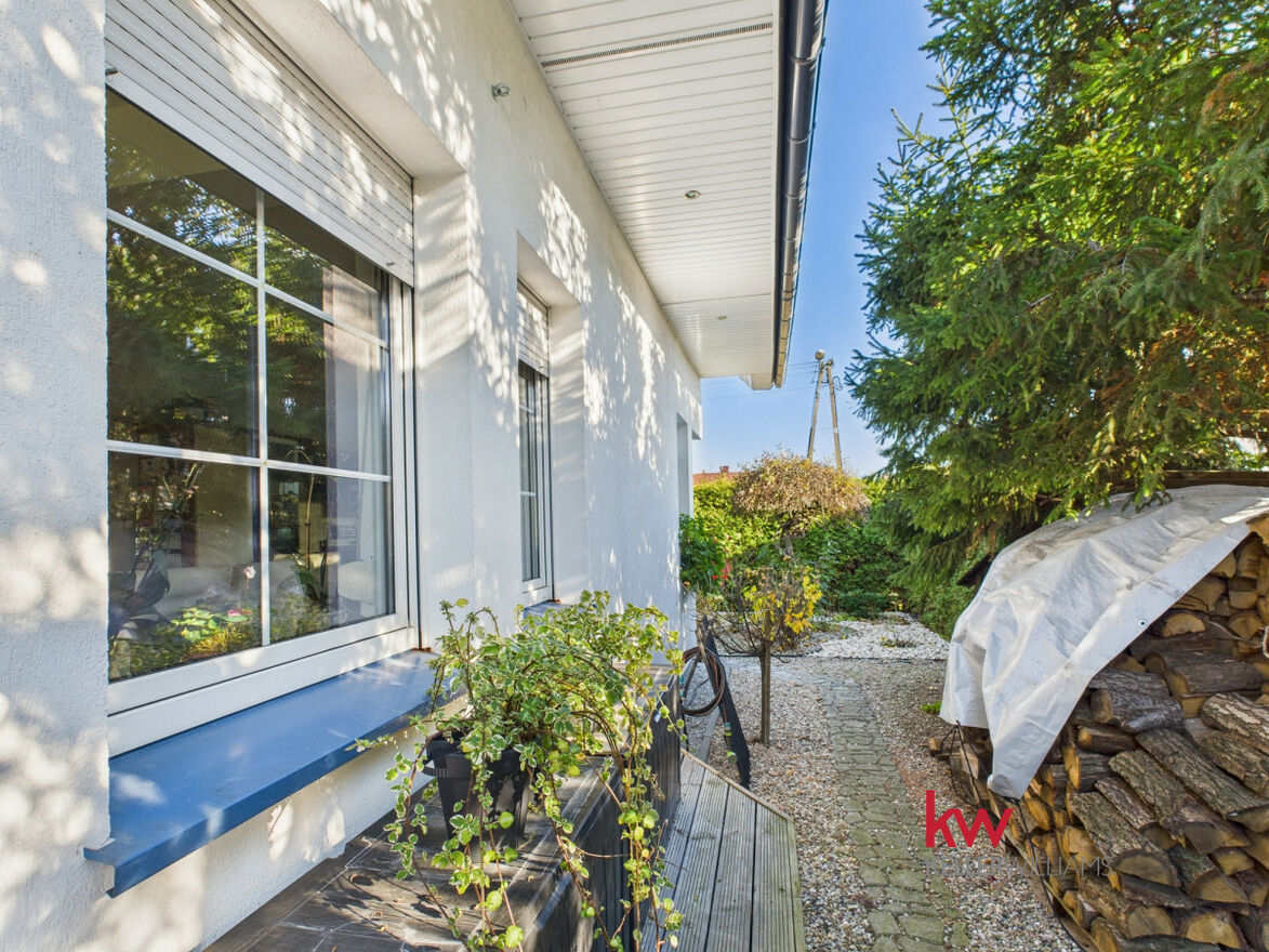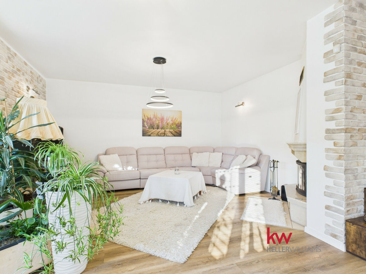 Część dzienna jest doskonale doświetlona dzięki dużym oknom od strony południowej i zachodniej. Salon oferuje widok na zadbany ogród, za którym rozciąga się pole sąsiada - brak zabudowy gwarantuje ciszę, prywatność i piękne widoki przez cały rok.