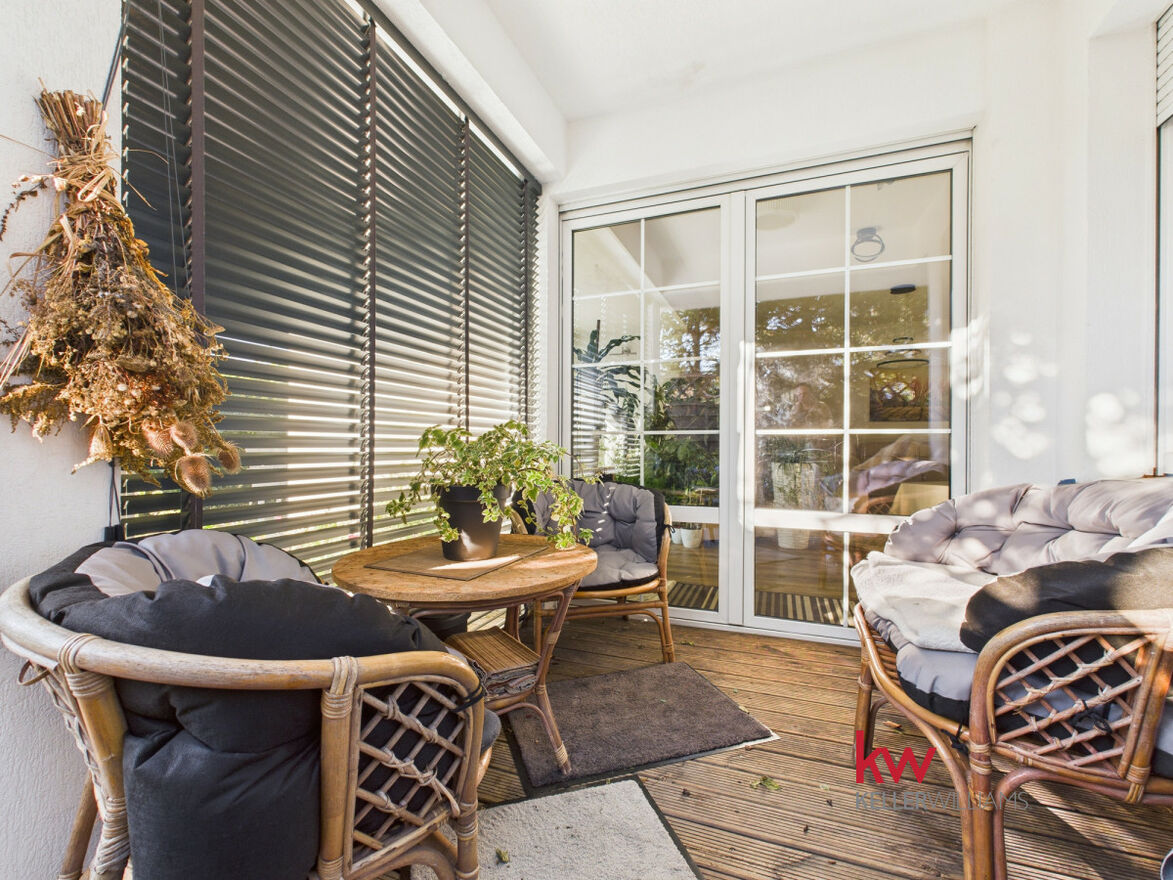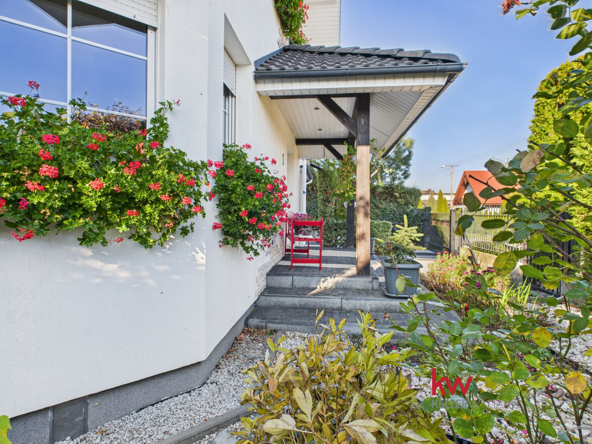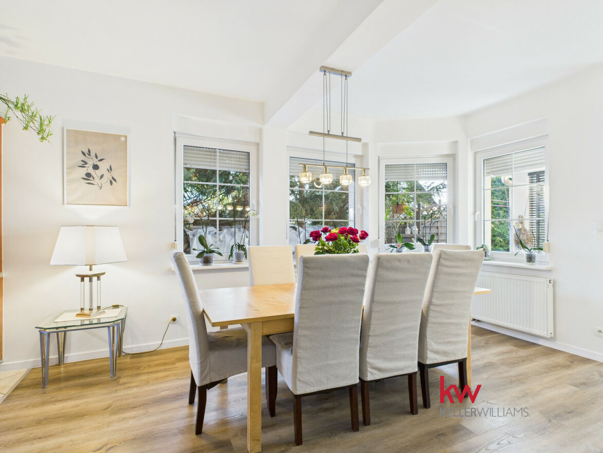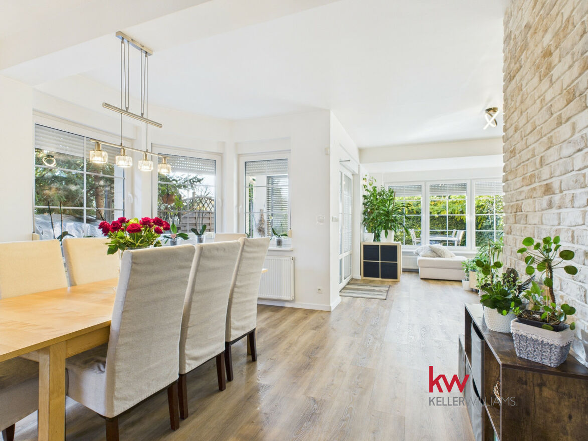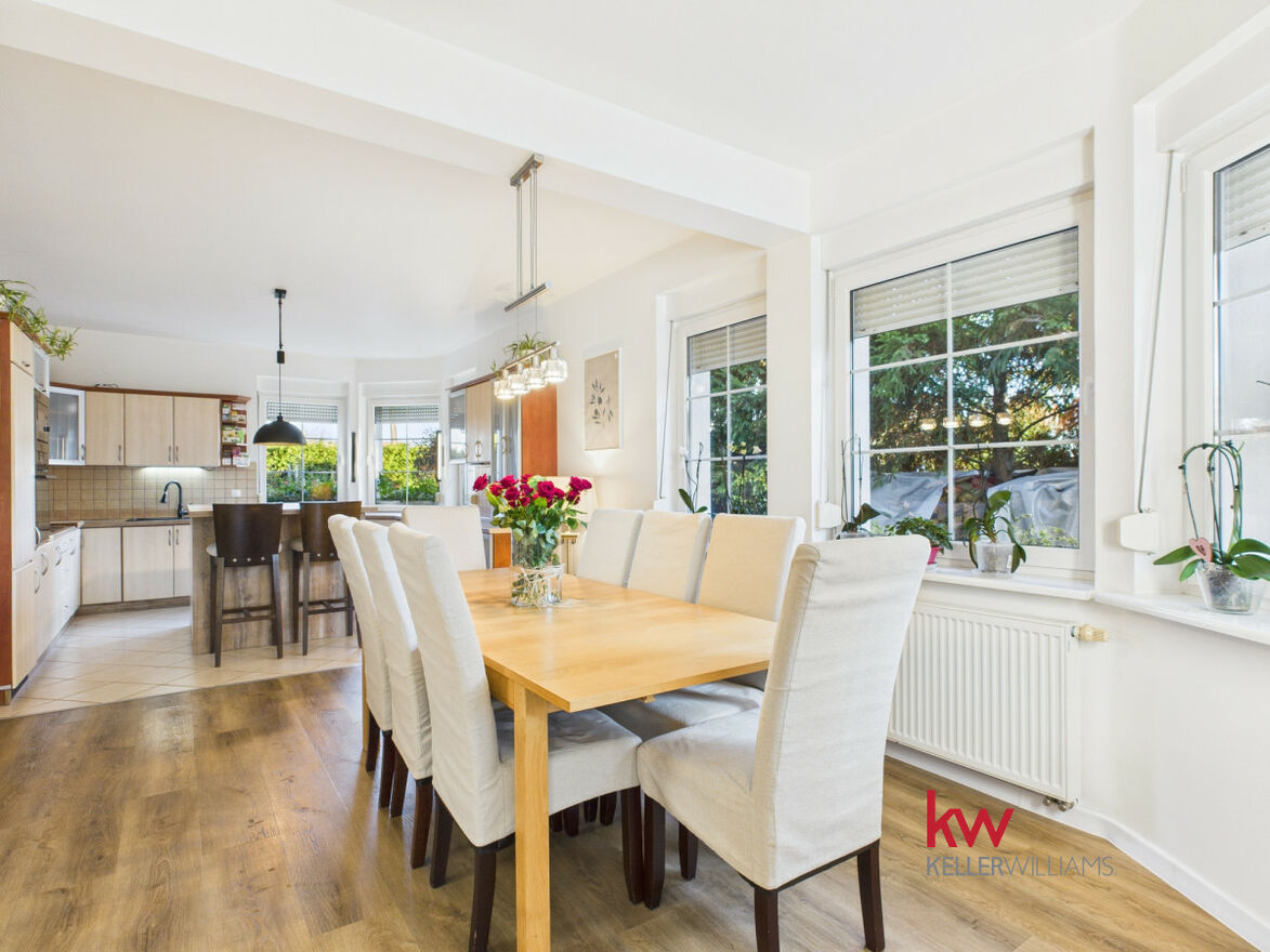 Część dzienna jest doskonale doświetlona dzięki dużym oknom od strony południowej i zachodniej. Salon oferuje widok na zadbany ogród, za którym rozciąga się pole sąsiada - brak zabudowy gwarantuje ciszę, prywatność i piękne widoki przez cały rok.