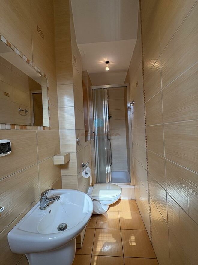 - łazienki z oknem, kabiną prysznicową, umywalką i toaletą, wyłożonej estetyczną ceramiką podłogową i ścienną;