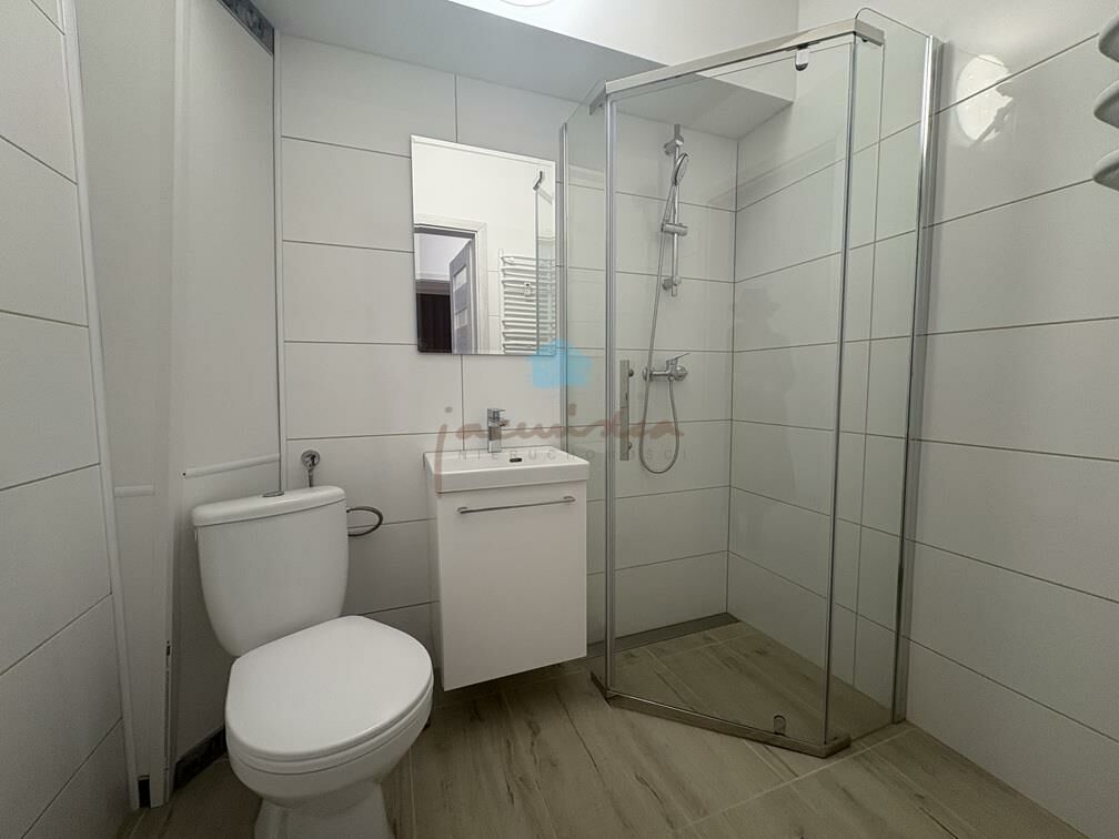 - łazienki połączonej z WC (3,38 m2), wyposażonej w szklaną kabinę prysznicową, umywalkę z podwieszaną szafką umywalkową oraz toaletę typu kompakt, gdzie podłoga i ściany wyłożone zostały estetycznymi kaflami ceramicznymi;