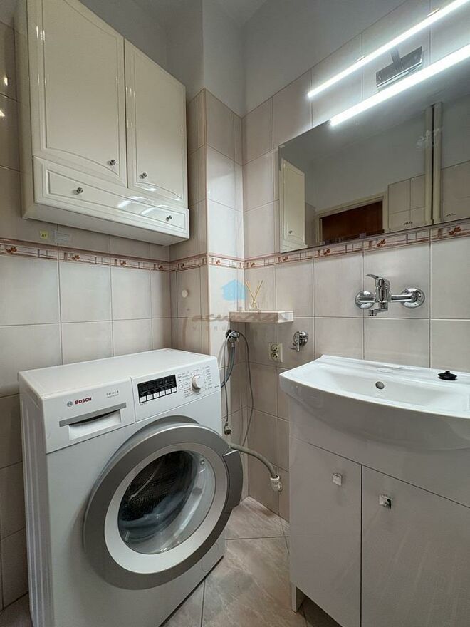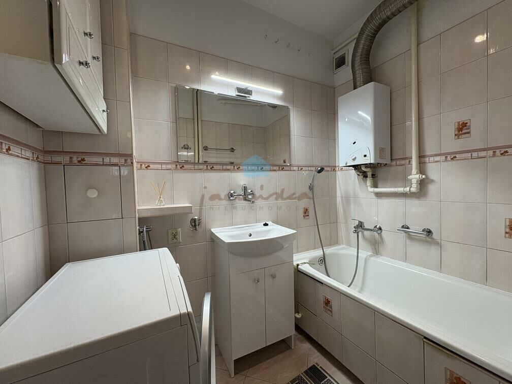 - samodzielnej łazienki (3,1 m2) z wanną, umywalką i pralką, gdzie podłoga i ściany wyłożone zostały płytkami ceramicznymi;