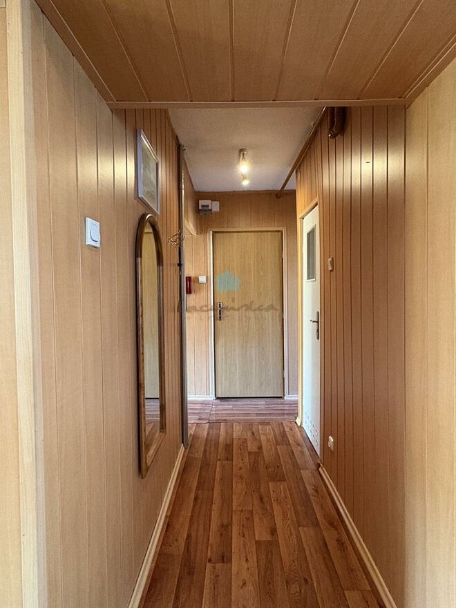 - przestronnego przedpokoju (ok. 8 m2) z szafą garderobianą w zabudowie, gdzie na podłodze położono dębowy parkiet, przykryty wykładziną PCV.