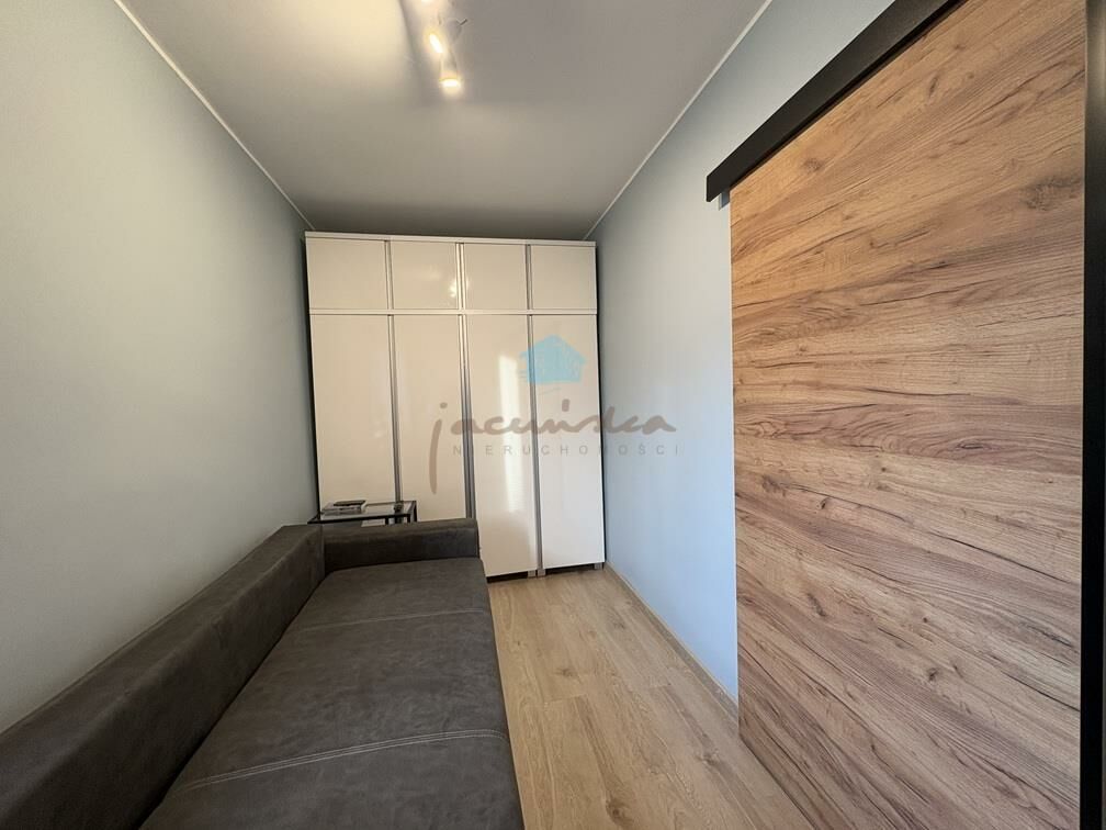- sypialnia z pojemną szafą garderobianą, komodą i rozkładaną kanapą z funkcją spania, gdzie podłoga wyłożona została drewnianymi panelami, a wygładzone ściany pomalowano zmywalną farbą w pastelowym odcieniu; drewniane przesuwne drzwi dodają wnętrzu charakteru i ne zabierają miejsca;