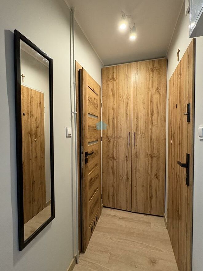- przedpokój z szafą garderobianą w zabudowie, podłogą wyłożoną panelami i wygładzonymi ścianami, pomalowanymi zmywalną farbą w pastelowym odcieniu.