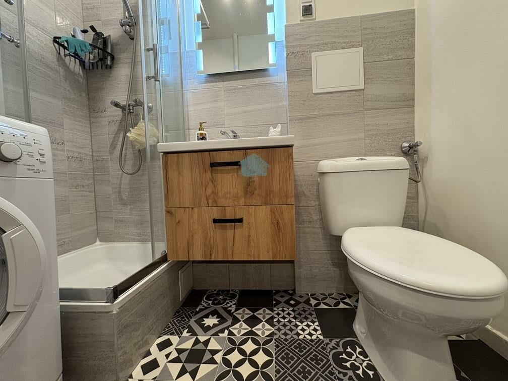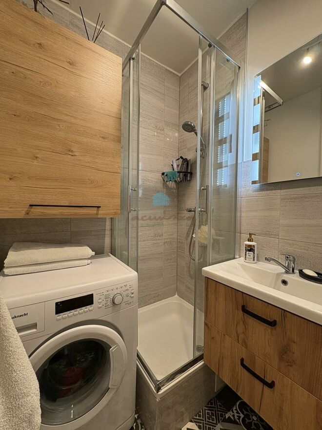 - łazienka z kabiną prysznicową, wc i umywalką oraz pralką i wiszącymi szafkami łazienkowymi, wyłożona estetyczną ceramiką podłogową i ścienną;