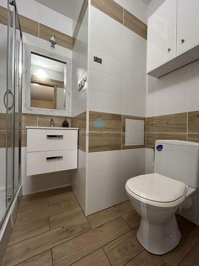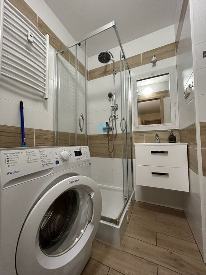 - łazienki połączonej z WC (ok. 4 m2), wyposażonej w kabinę prysznicową, umywalkę z szafką na kosmetyki, toaletę typu kompakt oraz pralkę automatyczną, gdzie podłoga i ściany wyłożone zostały estetycznymi kaflami ceramicznymi