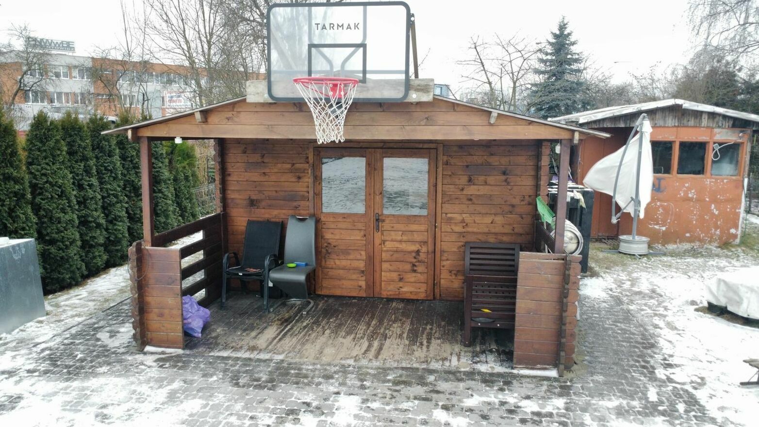 - Drewniany domek ogrodowy, wyposażony w podstawowe udogodnienia